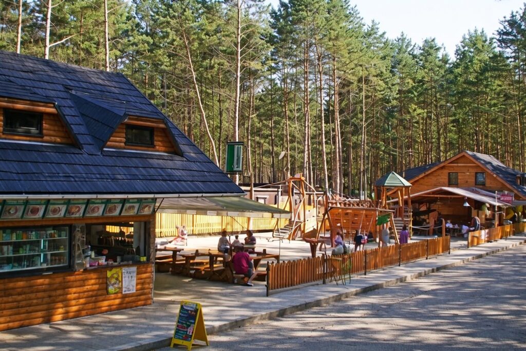 A rodiče si už mohou užít chvíle podle svého. Někteří se sesednou na terase s přáteli, dají si sklenku piva či vína, zahrají si karty nebo si jen povídají. V každém případě na ně také čeká bar, jehož přívětivé prostředí uvítají především v nestálém počasí. Kemp také pravidelně pořádá vystoupení s živou hudbou. Na nich by rozhodně neměl nikdo z ubytovaných chybět. Ačkoliv, ne každý je tak společenský. Někteří si naopak chtějí užít večerní klid. Zaposlouchat se do osamocených výkřiků usínajících ptáků, skřehotání žab a usednou s prutem ke břehu jezera. Pro samotáře bude sportovní rybolov tím správným zakončením dne.